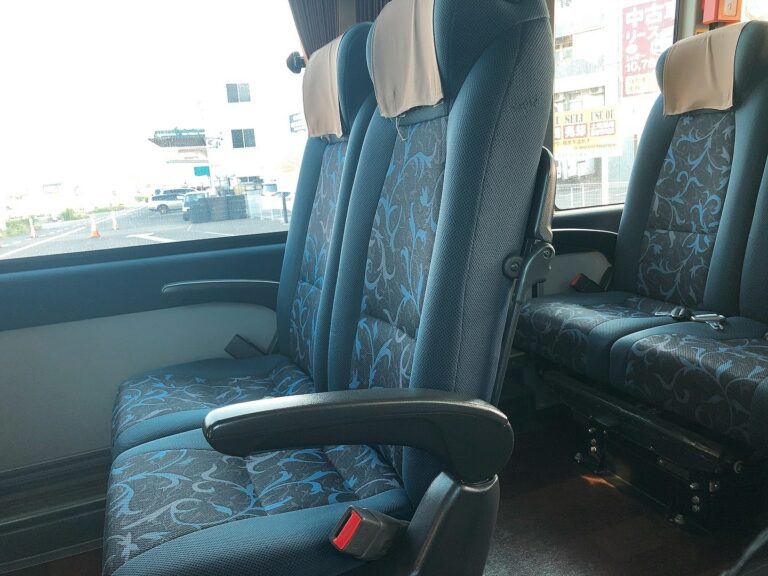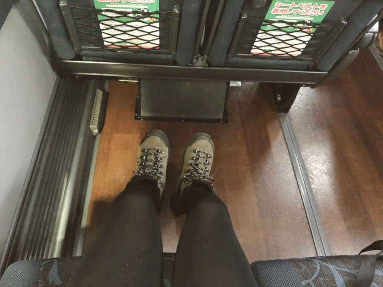 車内は机付きの4列シート。普通のバスと比べ前後の間隔が広く感じました。足を伸ばしても余裕があるので、トレッキングシューズに履き替えるのもラクラクでした♩乗車時間が短いこともあり、お手洗いはついていませんでした。