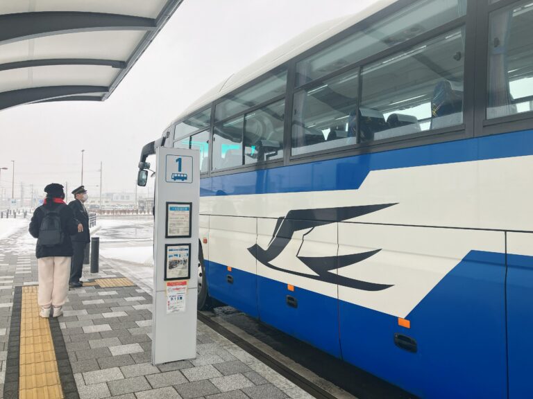 ちなみに、バスのりばには待合所がないので、時間ギリギリまで駅構内で待つのがおすすめ。筆者も【JR東北バス】が来たのを確認してから、のりばまで降りていきました。