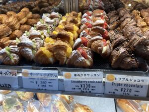下段にサンドイッチやおかずパンといったモーニングイメージの強いもの、上段にはメープルやフルーツなどの豊富な種類のクロワッサンが並びます。