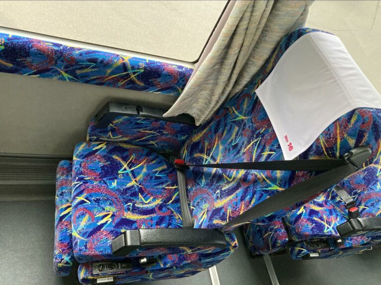バスの車内は、三列かつカーテンの仕切り、フットレストもありかなり快適です。