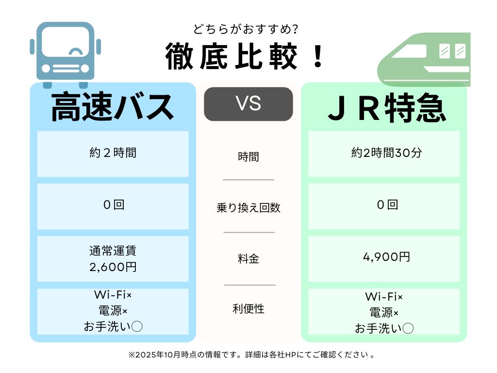 JR特急を使用した場合と比較すると、なんと約47%オフ!しかも、バスの方が30分ほど早く到着します。