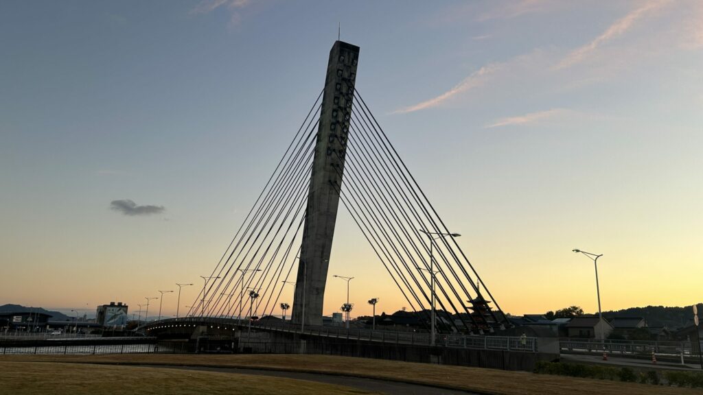 道中、日本海側最大級の斜張橋「新湊(しんみなと)大橋」を渡っていくのですが、すでにこの絶景。旅のワクワク感が高まります。