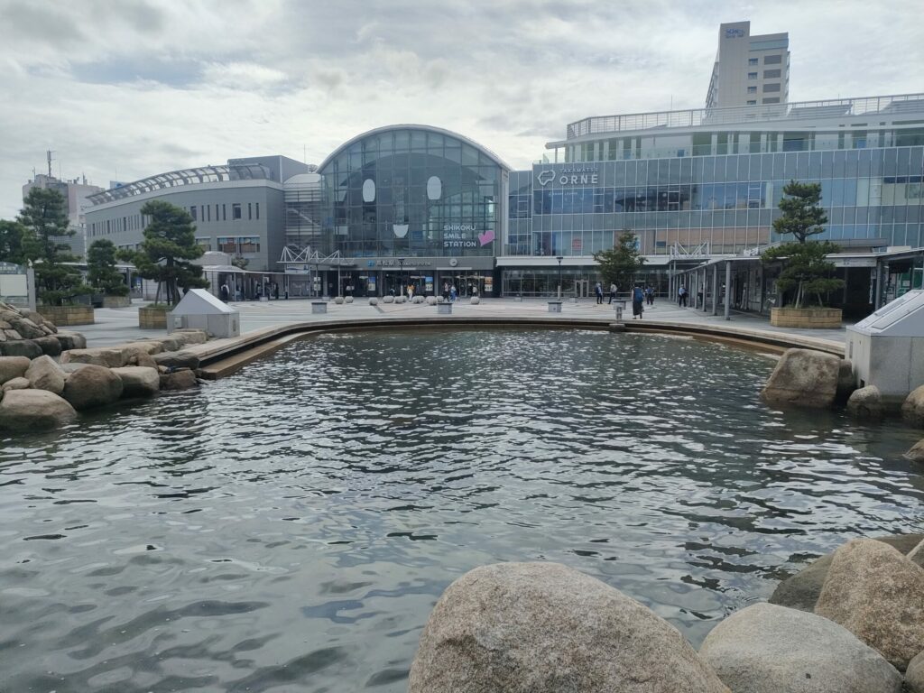 JR高松駅の目印は大きな海水の池。これが見えたら正解です。