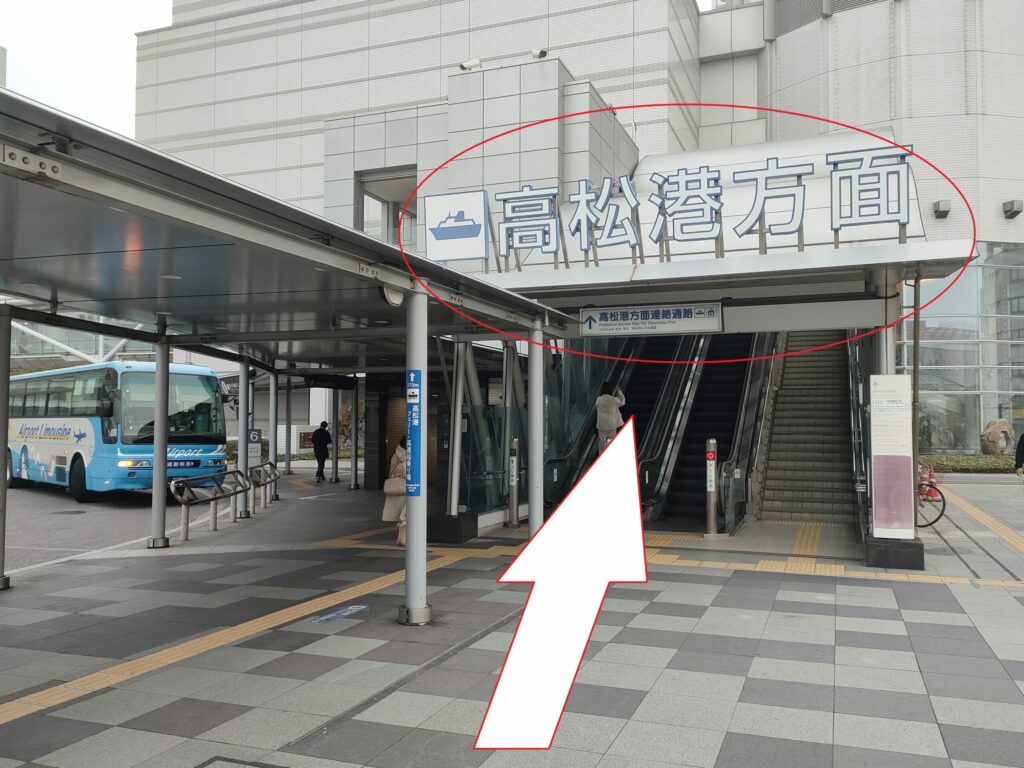 しばらく歩くと斜め右方向に「高松港方面」と大きく書かれたエスカレーターが見えてきます。