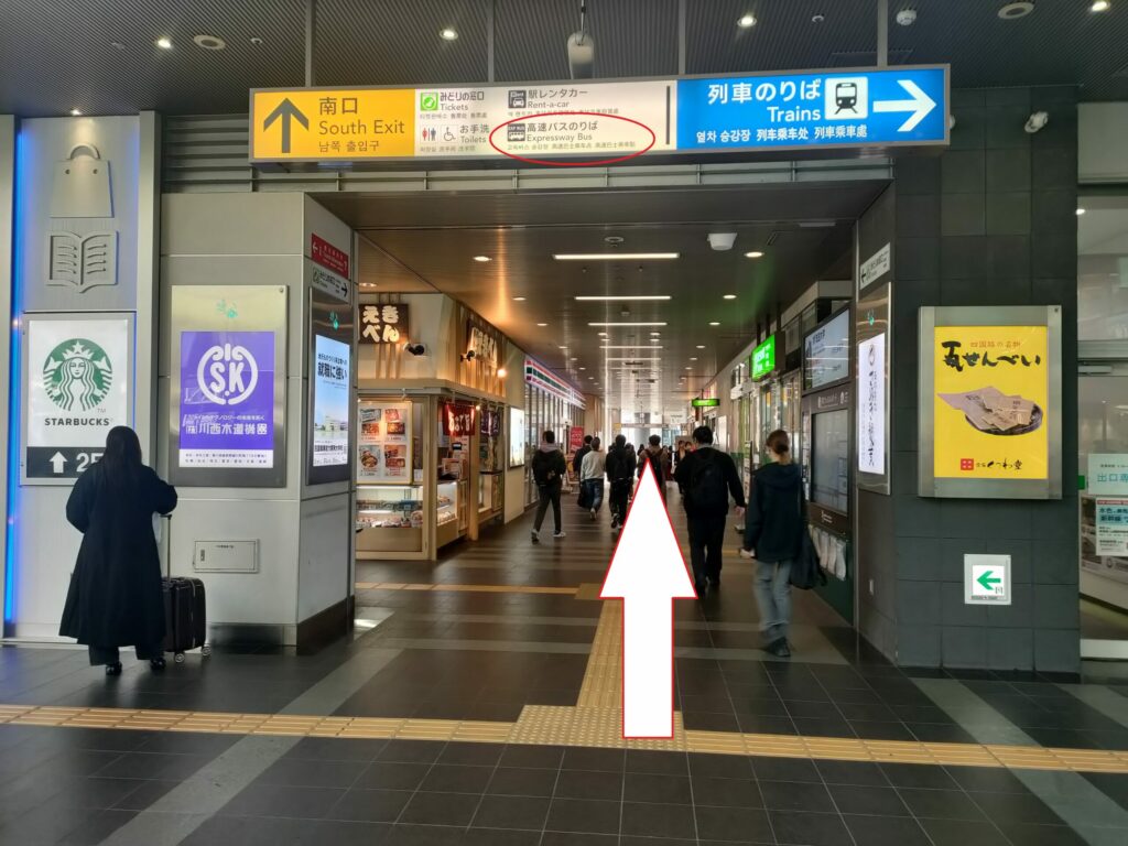 写真の矢印をまっすぐ進めば、高松駅高速バスターミナルに到着です!JR高松駅からは途中に階段や信号もないのでわかりやすい構造です。