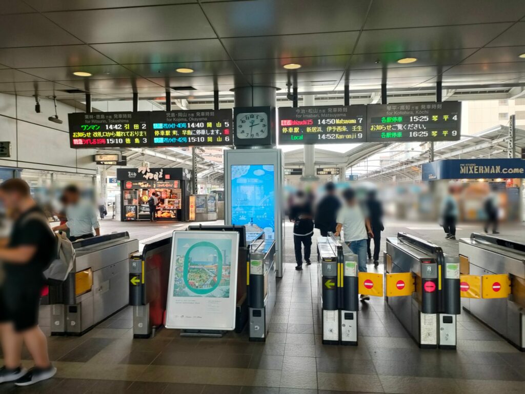 JR高松駅の改札は、先頭車両側1ヶ所のみ。先頭車両に乗車する方が改札に近いですが、その分混雑している傾向があります。岡山ー高松間を運行するマリンライナーの高松側先頭車両は、指定席となっているため、注意が必要ですよ。