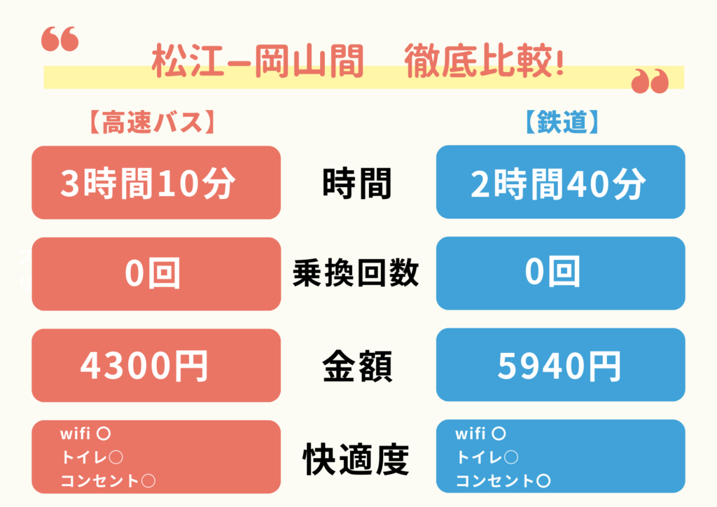 最後に、松江ー岡山間の移動コスパを、高速バスと鉄道で比較してみました。