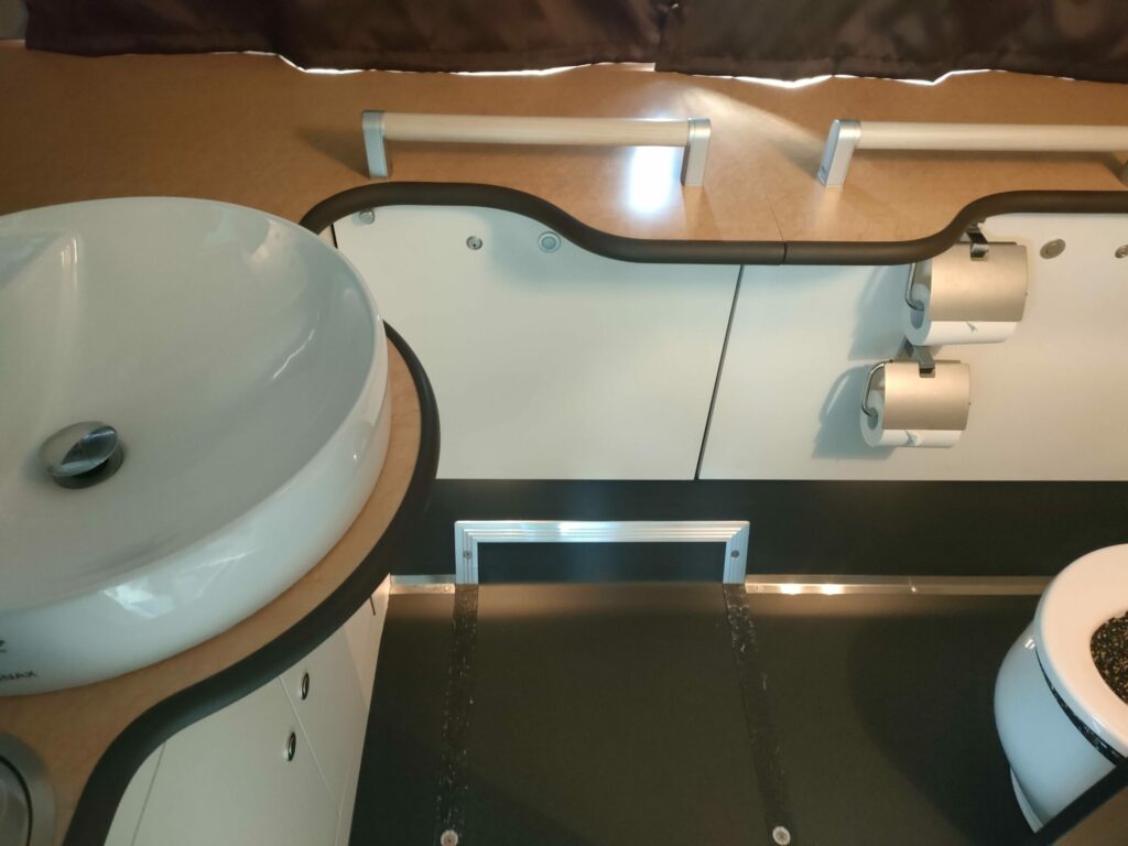 お手洗いは車内後方真ん中にあります。清潔感があり、バス車内とは思えないぐらいオシャレです。