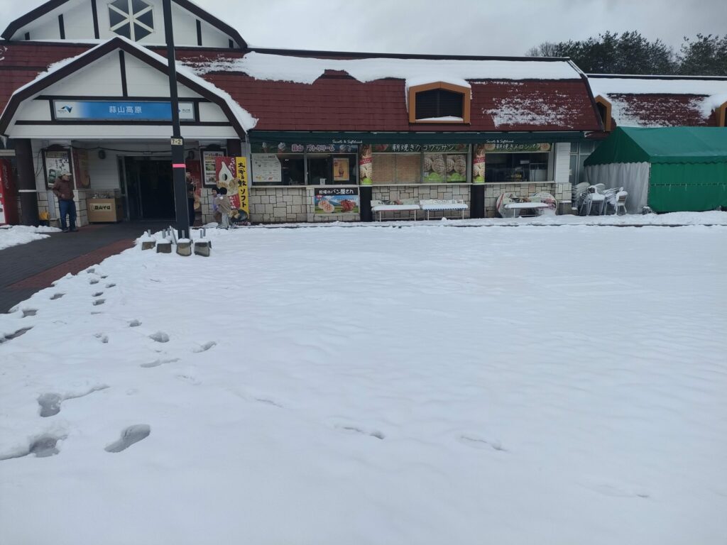 途中の休憩地、蒜山高原(ひるぜんこうげん)サービスエリアはまるで雪国。20分ほど休憩があり、雪遊びを楽しんでいる家族連れもいるほどでした。