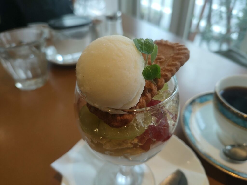 今回はパフェにコーヒーのセットを注文。旅行中はどこか疲れているので、フルーツの弾ける栄養が体に染みます。